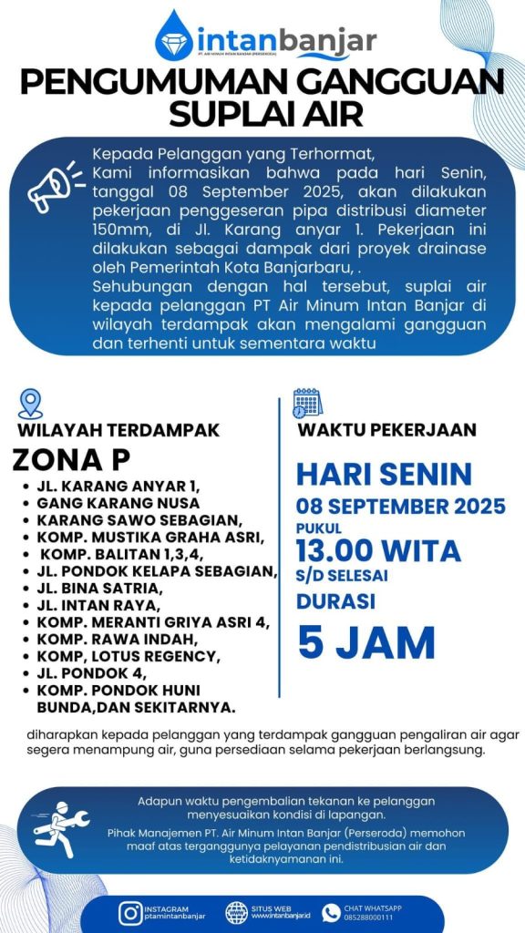 Liputan24.Net — PT Air Minum (PTAM) Intan Banjar menginformasikan bahwa akan terjadi gangguan suplai air di beberapa wilayah pada Senin, 8 September 2025. Hal ini disebabkan oleh pekerjaan penggeseran pipa distribusi berdiameter 150mm di Jalan Karang Anyar 1.