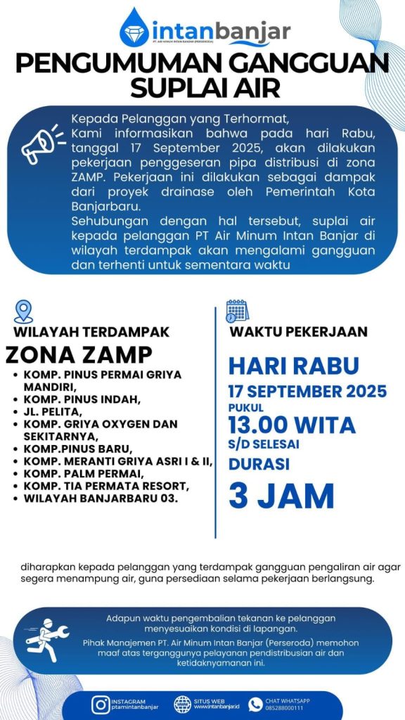 Liputan24.Net – PT Air Minum (PTAM) Intan Banjar mengumumkan adanya gangguan pasokan air sementara di sejumlah wilayah Banjarbaru pada Rabu, 17 September 2025.