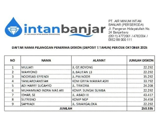 Liputan24.Net – PT Air Minum (PTAM) Intan Banjar (Perseroda) kembali mengumumkan daftar nama pelanggan yang terpilih program deposit untuk periode Oktober 2025. Total sembilan pelanggan yang menerima gratis tagihan satu bulan.