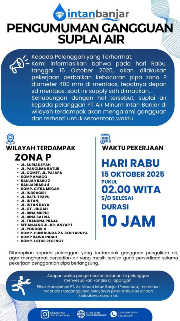 Liputan24.Net – PT Air Minum Intan Banjar (Perseroda) mengumumkan adanya gangguan suplai air bersih pada Rabu, 15 Oktober 2025. Gangguan ini disebabkan oleh perbaikan kebocoran pipa zona P berdiameter 400 mm di kawasan Mentaos, tepatnya di depan SD Mentaos.
