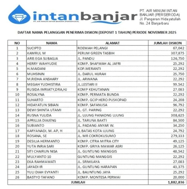 Ini Daftar Penerima Program Deposit PTAM Intan Banjar Periode November 2025