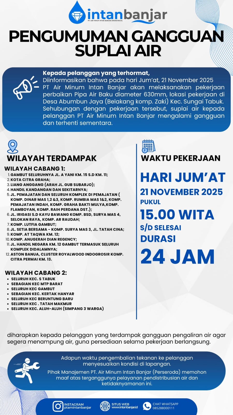Liputan24.Net – PT Air Minum (PTAM) Intan Banjar (Perseroda) mengumumkan adanya gangguan suplai air bersih yang akan berlangsung selama 24 jam, dimulai pada Jumat (21/11/2025) pukul 15.00 WITA.