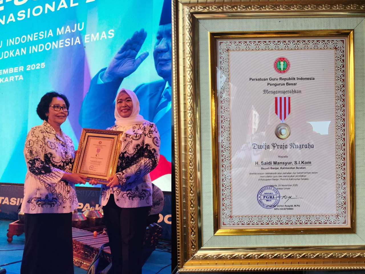 Liputan24.Net — Bupati Banjar, H. Saidi Mansyur, menjadi salah satu kepala daerah penerima penghargaan Dwija Praja Nugraha pada Puncak Peringatan Hari Ulang Tahun (HUT) ke-80 Persatuan Guru Republik Indonesia (PGRI). Acara penganugerahan berlangsung di Britama Arena Kelapa Gading, Jakarta, pada Sabtu (29/11/2025).
