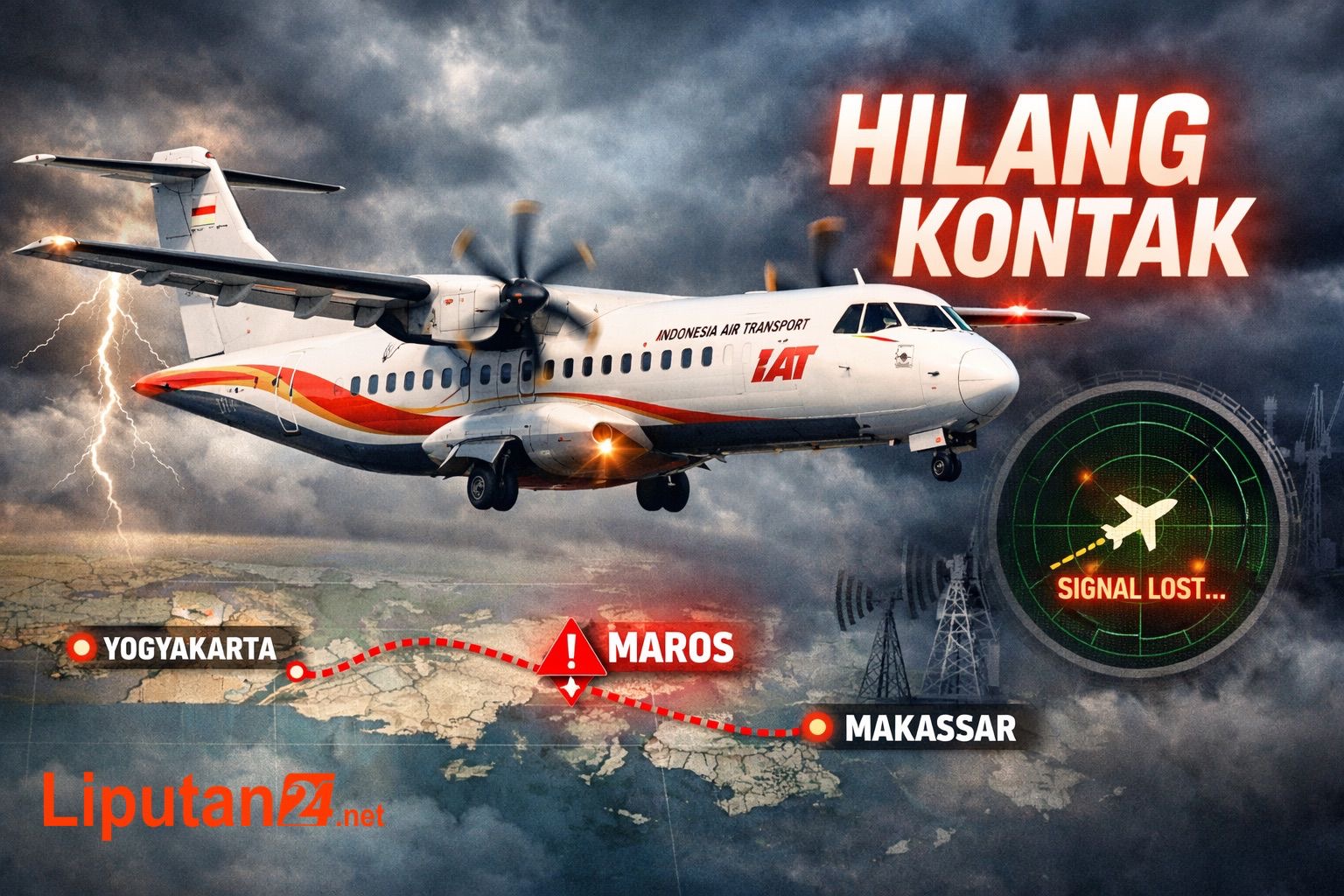 Liputan24.Net—Nasional. Sebuah pesawat jenis ATR 400 milik Indonesia Air Transport (IAT) yang membawa 11 orang dilaporkan hilang kontak saat melakukan penerbangan dari Bandara Adisutjipto, Yogyakarta menuju Bandara Sultan Hasanuddin, Makassar pada Sabtu siang sekitar pukul 13.17 WITA. Pesawat tersebut terakhir diketahui berada di wilayah perbatasan Kabupaten Maros dan Pangkep, Sulawesi Selatan.