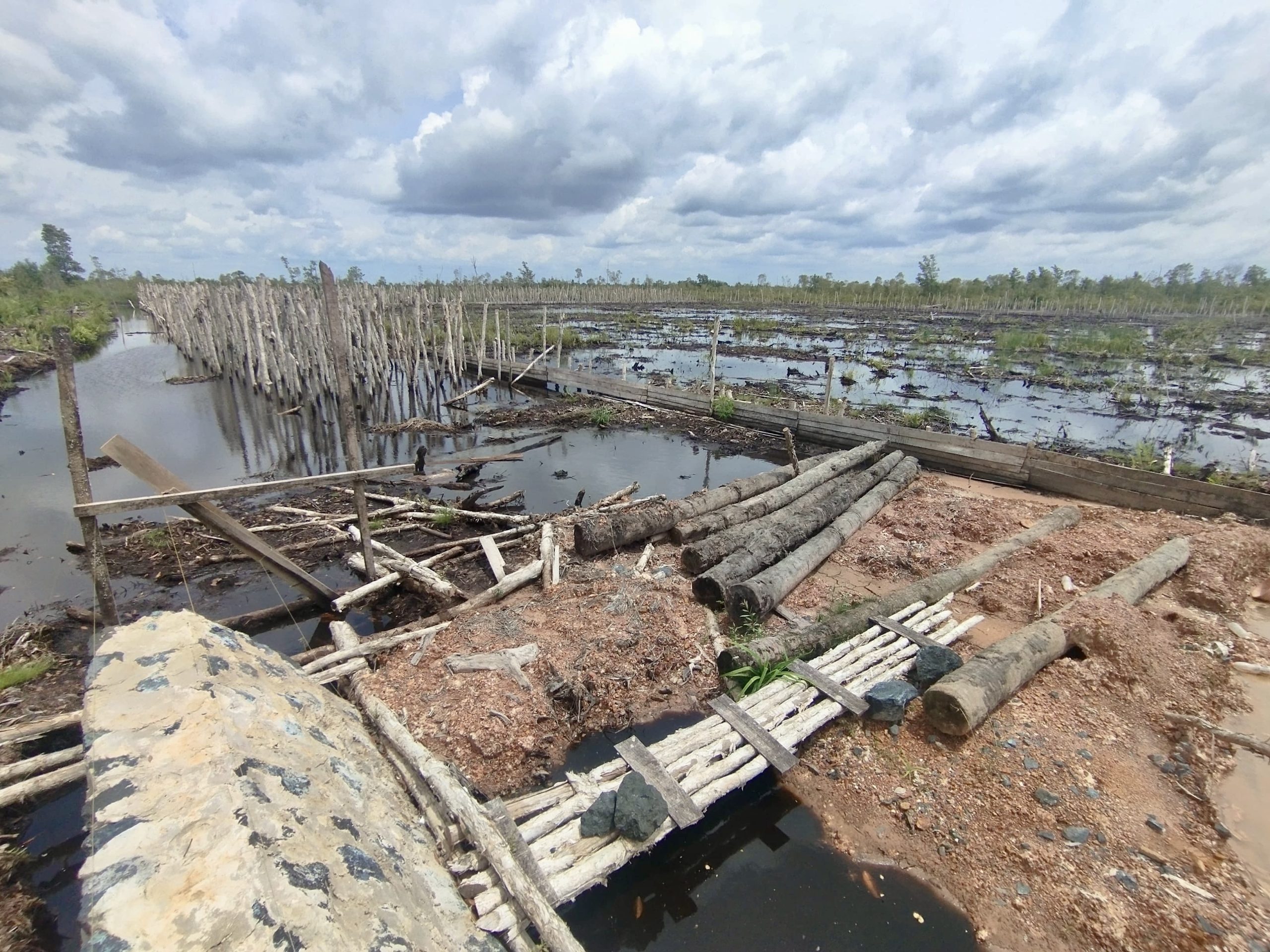 Pantauan di lapangan memperlihatkan area pembangunan dalam kondisi sepi. Tidak tampak pekerja maupun alat berat, sementara lahan masih berupa tanah basah dan berlumpur dengan kayu galam tertancap sebagai bagian dari penguatan lahan rawa. Di lokasi juga tidak ditemukan papan informasi proyek.