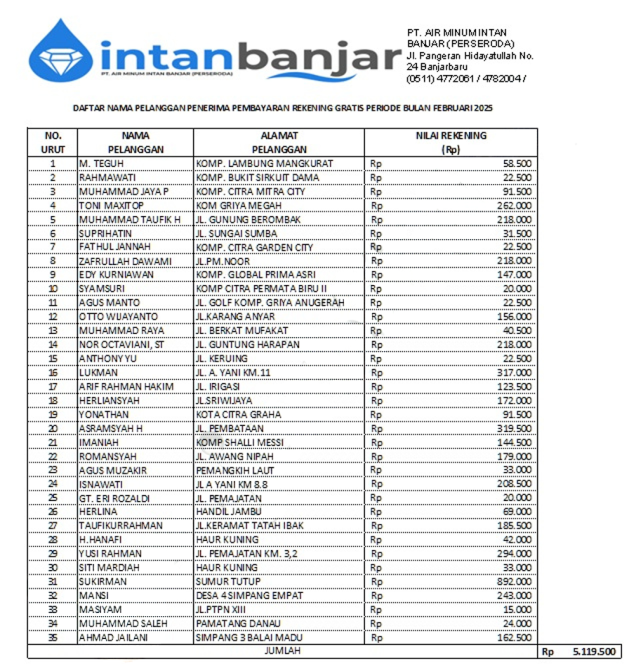 Banjarbaru, Liputan14.Net – Sebanyak 35 pelanggan beruntung menerima apresiasi berupa pembayaran tagihan rekening air gratis untuk periode Februari 2026 dari PT Air Minum (PTAM) Intan Banjar (Perseroda).