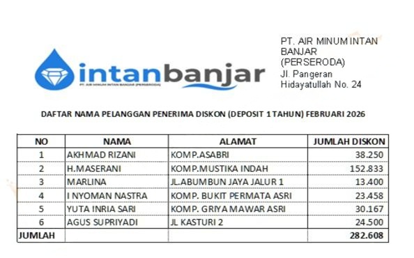 Inilah Daftar Penerima Program Deposit PTAM Intan Banjar Periode Februari