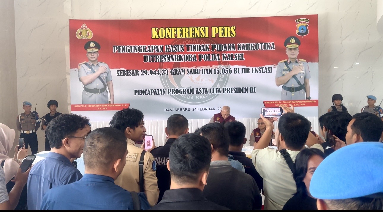 Liputan24.net — Banjarbaru. Direktorat Reserse Narkoba (Ditresnarkoba) Polda Kalimantan Selatan berhasil mengungkap kasus peredaran narkotika dengan barang bukti 29.944,33 gram sabu dan 15.056 butir ekstasi. Dalam operasi tersebut, polisi mengamankan satu tersangka berinisial IW yang diduga terkait jaringan narkotika internasional Freddy Pratama.