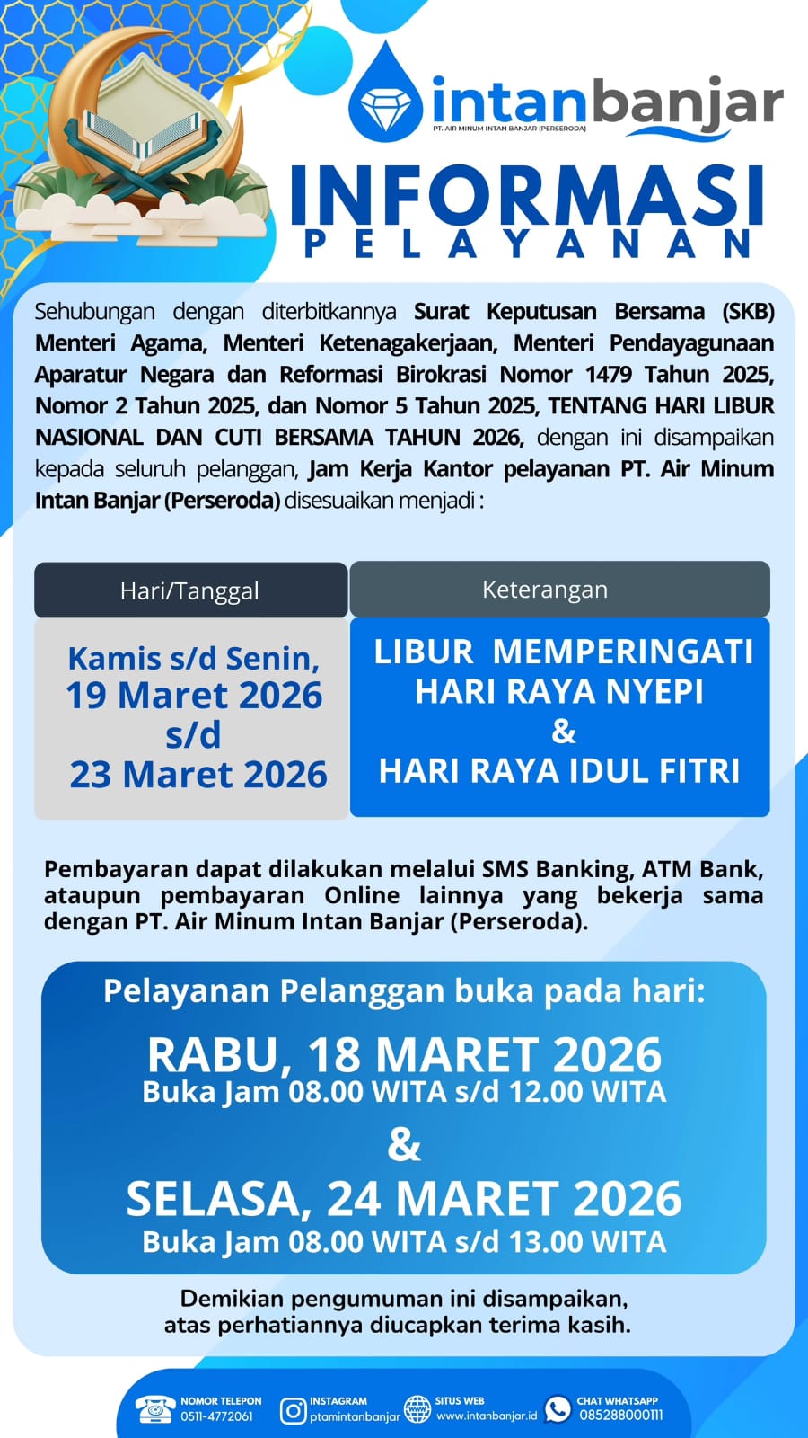 Dalam pengumuman yang disampaikan melalui media sosial resmi PTAM Intan Banjar, pelayanan kantor dinyatakan libur mulai Kamis, 19 Maret 2026 hingga Senin, 23 Maret 2026. Libur tersebut dalam rangka memperingati Hari Raya Nyepi dan Hari Raya Idul Fitri.